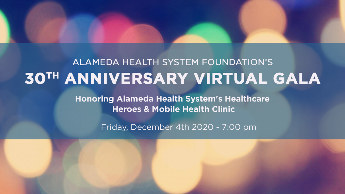 Please join us virtually on Friday, December 4, 2020 from 7 – 8:00 p.m. for the Alameda Health System Foundation’s 30th Anniversary Gala. Attendance is free and everyone is invited to attend.  This year the gala will celebrate and recognize Alameda County’s Health Care Heroes and Mobile Clinic.